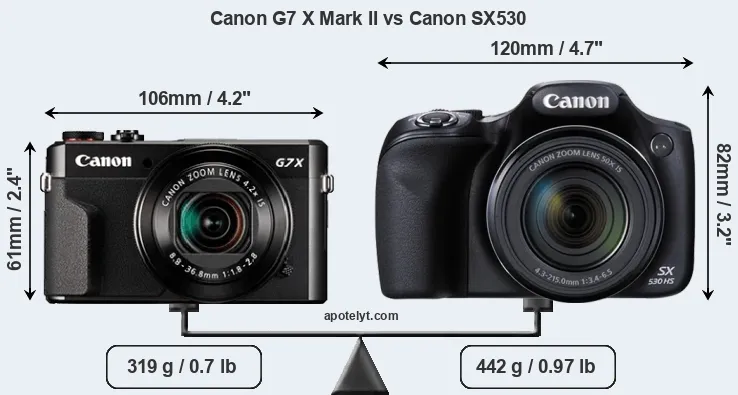 If the front view area (width x height) of the cameras is taken as an aggregate measure of their size, the Canon SX530 is considerably larger (52 percent) than the Canon G7 X Mark II. Moreover, the SX530 is substantially heavier (39 percent) than the G7X Mark II. In this context, it is worth noting that neither the G7X Mark II nor the SX530 are weather-sealed.
