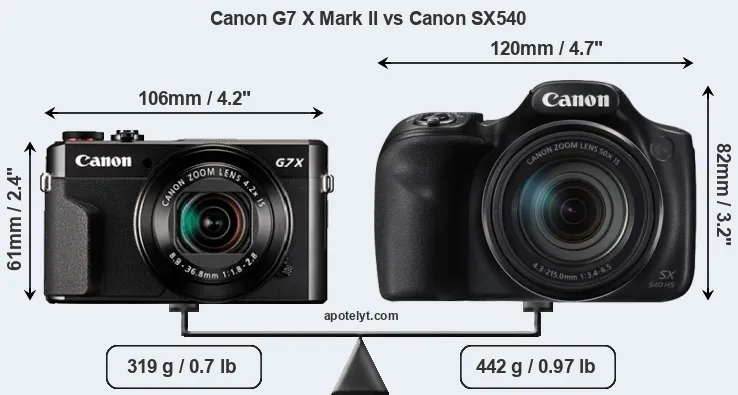 If the front view area (width x height) of the cameras is taken as an aggregate measure of their size, the Canon SX540 is considerably larger (52 percent) than the Canon G7 X Mark II. Moreover, the SX540 is substantially heavier (39 percent) than the G7X Mark II. In this context, it is worth noting that neither the G7X Mark II nor the SX540 are weather-sealed.