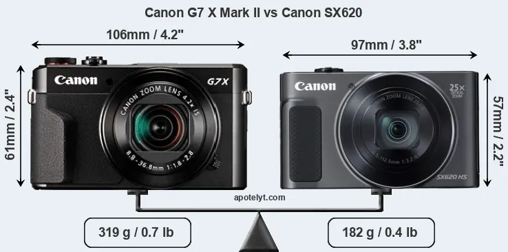 The side-by-side display below illustrates the physical size and weight of the Canon G7 X Mark II and the Canon SX620. The two cameras are presented according to their relative size. Three successive views from the front, the top, and the rear are shown. All width, height and depth measures are rounded to the nearest millimeter.