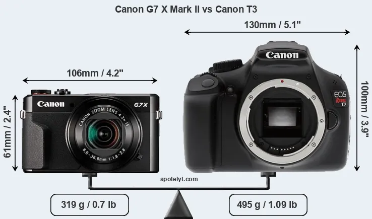 The physical size and weight of the Canon G7 X Mark II and the Canon T3 are illustrated in the side-by-side display below. The two cameras are presented according to their relative size. Three successive views from the front, the top, and the rear are shown. All width, height and depth dimensions are rounded to the nearest millimeter.
