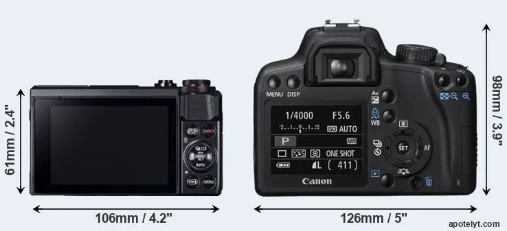 The side-by-side display below illustrates the physical size and weight of the Canon G7 X Mark II and the Canon XS. The two cameras are presented according to their relative size. Three consecutive perspectives from the front, the top, and the back are available. All width, height and depth measures are rounded to the nearest millimeter.