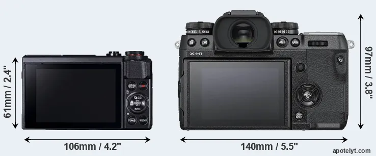 The above size and weight comparisons are to some extent incomplete and possibly misleading, as the G7X Mark II has a lens built in, whereas the X-H1 is an interchangeable lens camera that requires a separate lens. Attaching the latter will add extra weight and bulk to the setup. You can compare the optics available for the X-H1 and their specifications in the Fujinon X Lens Catalog.