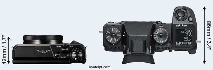 If the front view area (width x height) of the cameras is taken as an aggregate measure of their size, the Fujifilm X-H1 is considerably larger (110 percent) than the Canon G7 X Mark II. It is noteworthy in this context that the X-H1 is splash and dust-proof, while the G7X Mark II does not feature any corresponding weather-sealing.