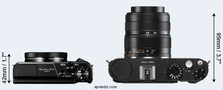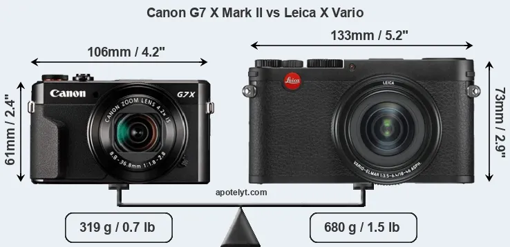 If the front view area (width x height) of the cameras is taken as an aggregate measure of their size, the Leica X Vario is considerably larger (50 percent) than the Canon G7 X Mark II. Moreover, the X Vario is substantially heavier (113 percent) than the G7X Mark II. In this context, it is worth noting that neither the G7X Mark II nor the X Vario are weather-sealed.