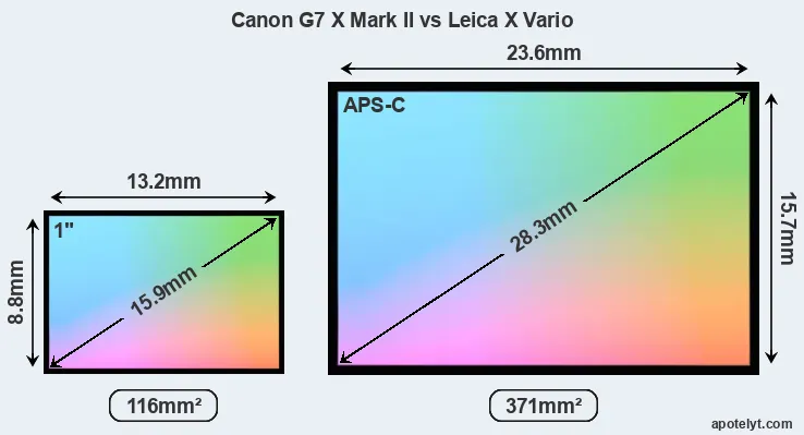 Of the two cameras under consideration, the Canon G7 X Mark II features an one-inch sensor and the Leica X Vario an APS-C sensor. The sensor area in the X Vario is 220 percent bigger. As a result of these sensor size differences, the cameras have a format factor of, respectively, 2.7 and 1.5. Both cameras have a native aspect ratio (sensor width to sensor height) of 3:2.