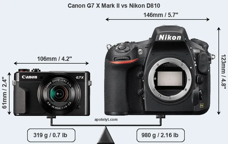 An illustration of the physical size and weight of the Canon G7 X Mark II and the Nikon D810 is provided in the side-by-side display below. The two cameras are presented according to their relative size. Three consecutive perspectives from the front, the top, and the back are available. All width, height and depth measures are rounded to the nearest millimeter.