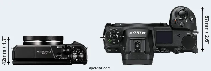 If the front view area (width x height) of the cameras is taken as an aggregate measure of their size, the Nikon Z7 is considerably larger (109 percent) than the Canon G7 X Mark II. It is noteworthy in this context that the Z7 is splash and dust-proof, while the G7X Mark II does not feature any corresponding weather-sealing.
