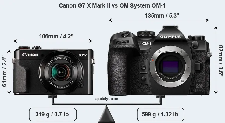 If the front view area (width x height) of the cameras is taken as an aggregate measure of their size, the OM System OM-1 is considerably larger (92 percent) than the Canon G7 X Mark II. It is noteworthy in this context that the OM-1 is splash and dust-proof, while the G7X Mark II does not feature any corresponding weather-sealing.
