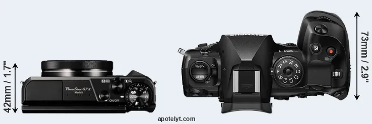 The above size and weight comparisons are to some extent incomplete and possibly misleading, as the G7X Mark II has a lens built in, whereas the OM-1 is an interchangeable lens camera that requires a separate lens. Attaching the latter will add extra weight and bulk to the setup. You can compare the optics available for the OM-1 and their specifications in the Micro Four Thirds Lens Catalog.