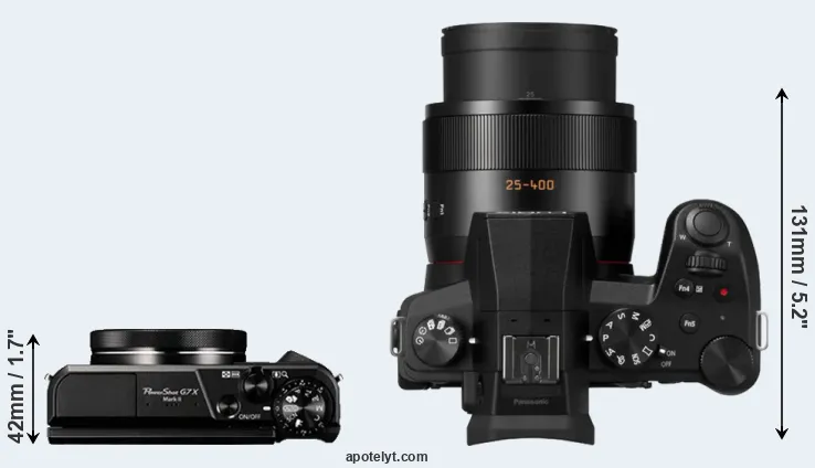 The side-by-side display below illustrates the physical size and weight of the Canon G7 X Mark II and the Panasonic FZ1000 II. The two cameras are presented according to their relative size. Three consecutive perspectives from the front, the top, and the back are available. All width, height and depth measures are rounded to the nearest millimeter.