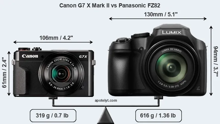If the front view area (width x height) of the cameras is taken as an aggregate measure of their size, the Panasonic FZ82 is considerably larger (89 percent) than the Canon G7 X Mark II. Moreover, the FZ82 is substantially heavier (93 percent) than the G7X Mark II. In this context, it is worth noting that neither the G7X Mark II nor the FZ82 are weather-sealed.