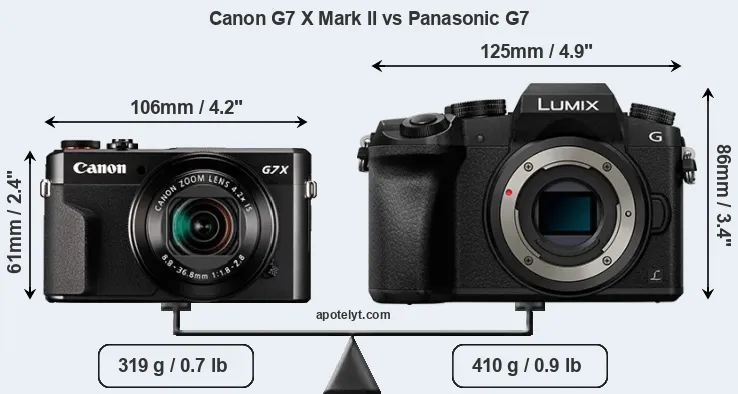 If the front view area (width x height) of the cameras is taken as an aggregate measure of their size, the Panasonic G7 is considerably larger (66 percent) than the Canon G7 X Mark II. In this context, it is worth noting that neither the G7X Mark II nor the G7 are weather-sealed.
