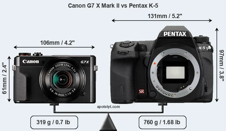 If the front view area (width x height) of the cameras is taken as an aggregate measure of their size, the Pentax K-5 is considerably larger (97 percent) than the Canon G7 X Mark II. It is noteworthy in this context that the K-5 is splash and dust-proof, while the G7X Mark II does not feature any corresponding weather-sealing.