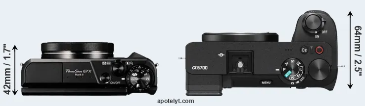 If the front view area (width x height) of the cameras is taken as an aggregate measure of their size, the Sony A6700 is notably larger (30 percent) than the Canon G7 X Mark II. It is noteworthy in this context that the A6700 is splash and dust-proof, while the G7X Mark II does not feature any corresponding weather-sealing.