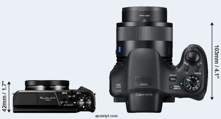 The side-by-side display below illustrates the physical size and weight of the Canon G7 X Mark II and the Sony HX350. The two cameras are presented according to their relative size. Three consecutive perspectives from the front, the top, and the back are available. All width, height and depth measures are rounded to the nearest millimeter.