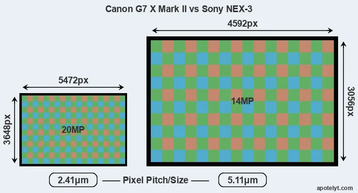 Despite having a smaller sensor, the Canon G7 X Mark II offers a higher resolution of 20 megapixels, compared with 14 MP of the Sony NEX-3. This megapixels advantage comes at the cost of a higher pixel density and a smaller size of the individual pixel (with a pixel pitch of 2.41μm versus 5.11μm for the NEX-3). However, it should be noted that the G7X Mark II is much more recent (by 5 years and 9 months) than the NEX-3, and its sensor will have benefitted from technological advances during this time that make it possible to gather light more efficiently.