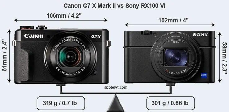 An illustration of the physical size and weight of the Canon G7 X Mark II and the Sony RX100 VI is provided in the side-by-side display below. The two cameras are presented according to their relative size. Three successive views from the front, the top, and the rear are shown. All width, height and depth dimensions are rounded to the nearest millimeter.