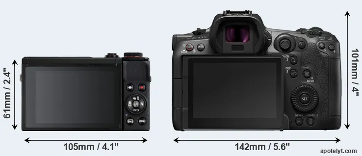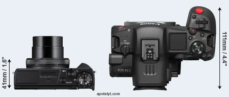 The above size and weight comparisons are to some extent incomplete and possibly misleading, as the G7X Mark III has a lens built in, whereas the R5 C is an interchangeable lens camera that requires a separate lens. Attaching the latter will add extra weight and bulk to the setup.