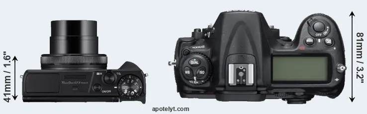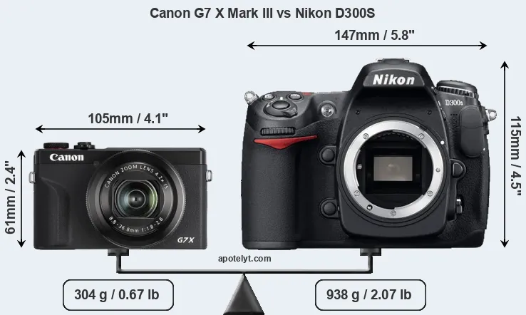 The side-by-side display below illustrates the physical size and weight of the Canon G7 X Mark III and the Nikon D300S. The two cameras are presented according to their relative size. Three consecutive perspectives from the front, the top, and the back are available. All width, height and depth dimensions are rounded to the nearest millimeter.