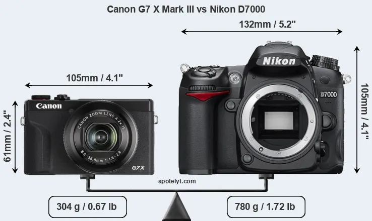 An illustration of the physical size and weight of the Canon G7 X Mark III and the Nikon D7000 is provided in the side-by-side display below. The two cameras are presented according to their relative size. Three consecutive perspectives from the front, the top, and the back are available. All width, height and depth measures are rounded to the nearest millimeter.