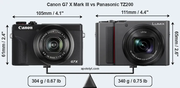 An illustration of the physical size and weight of the Canon G7 X Mark III and the Panasonic TZ200 is provided in the side-by-side display below. The two cameras are presented according to their relative size. Three successive views from the front, the top, and the rear are shown. All width, height and depth measures are rounded to the nearest millimeter.