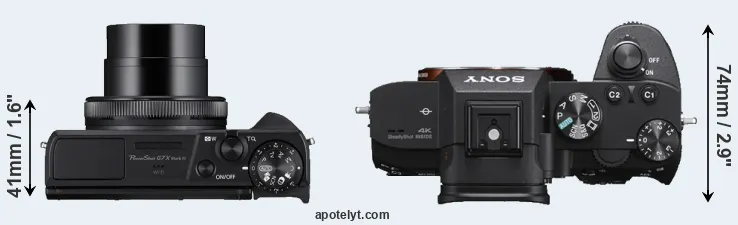 The physical size and weight of the Canon G7 X Mark III and the Sony A7 III are illustrated in the side-by-side display below. The two cameras are presented according to their relative size. Three consecutive perspectives from the front, the top, and the back are available. All width, height and depth dimensions are rounded to the nearest millimeter.