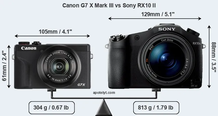If the front view area (width x height) of the cameras is taken as an aggregate measure of their size, the Sony RX10 II is considerably larger (77 percent) than the Canon G7 X Mark III. Moreover, the RX10 II is substantially heavier (167 percent) than the G7X Mark III. It is noteworthy in this context that the RX10 II is splash and dust-proof, while the G7X Mark III does not feature any corresponding weather-sealing.