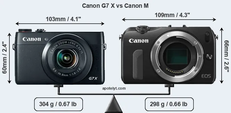 An illustration of the physical size and weight of the Canon G7 X and the Canon M is provided in the side-by-side display below. The two cameras are presented according to their relative size. Three successive views from the front, the top, and the rear are shown. All width, height and depth measures are rounded to the nearest millimeter.