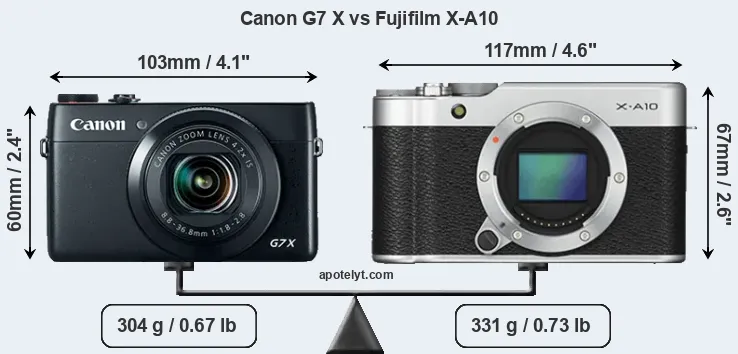 The physical size and weight of the Canon G7 X and the Fujifilm X-A10 are illustrated in the side-by-side display below. The two cameras are presented according to their relative size. Three consecutive views from the front, the top, and the rear side are shown. All size dimensions are rounded to the nearest millimeter.