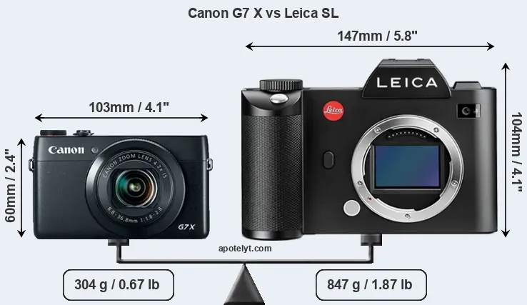 If the front view area (width x height) of the cameras is taken as an aggregate measure of their size, the Leica SL is considerably larger (147 percent) than the Canon G7 X. It is noteworthy in this context that the Leica SL is splash and dust-proof, while the G7X does not feature any corresponding weather-sealing.