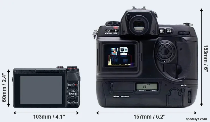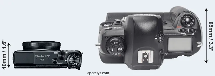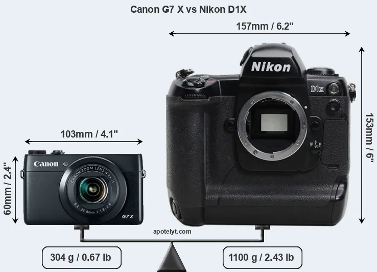 If the front view area (width x height) of the cameras is taken as an aggregate measure of their size, the Nikon D1X is considerably larger (289 percent) than the Canon G7 X. It is noteworthy in this context that the D1X is splash and dust-proof, while the G7X does not feature any corresponding weather-sealing.