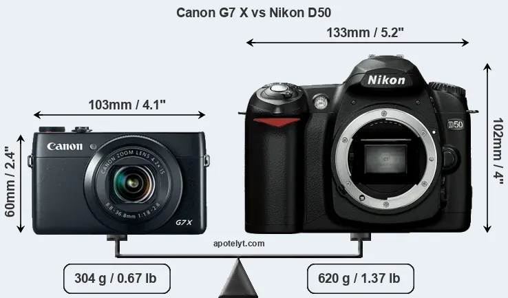 An illustration of the physical size and weight of the Canon G7 X and the Nikon D50 is provided in the side-by-side display below. The two cameras are presented according to their relative size. Three successive views from the front, the top, and the rear are shown. All width, height and depth dimensions are rounded to the nearest millimeter.