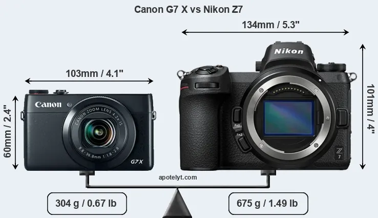 The physical size and weight of the Canon G7 X and the Nikon Z7 are illustrated in the side-by-side display below. The two cameras are presented according to their relative size. Three successive views from the front, the top, and the rear are shown. All width, height and depth measures are rounded to the nearest millimeter.