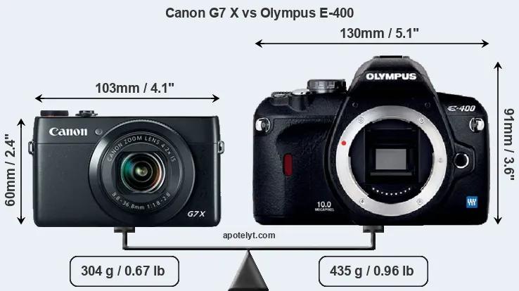 The physical size and weight of the Canon G7 X and the Olympus E-400 are illustrated in the side-by-side display below. The two cameras are presented according to their relative size. Three consecutive views from the front, the top, and the rear side are shown. All width, height and depth measures are rounded to the nearest millimeter.