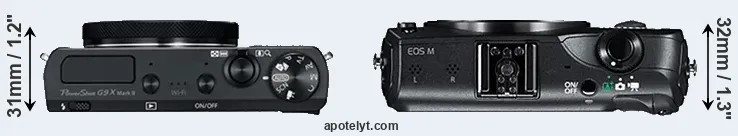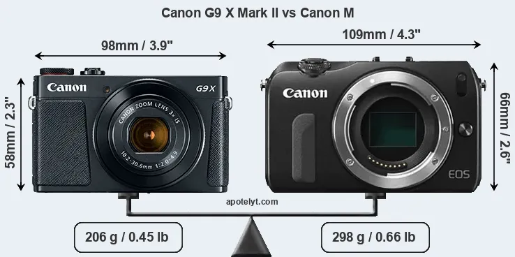 The physical size and weight of the Canon G9 X Mark II and the Canon M are illustrated in the side-by-side display below. The two cameras are presented according to their relative size. Three consecutive perspectives from the front, the top, and the back are available. All width, height and depth measures are rounded to the nearest millimeter.