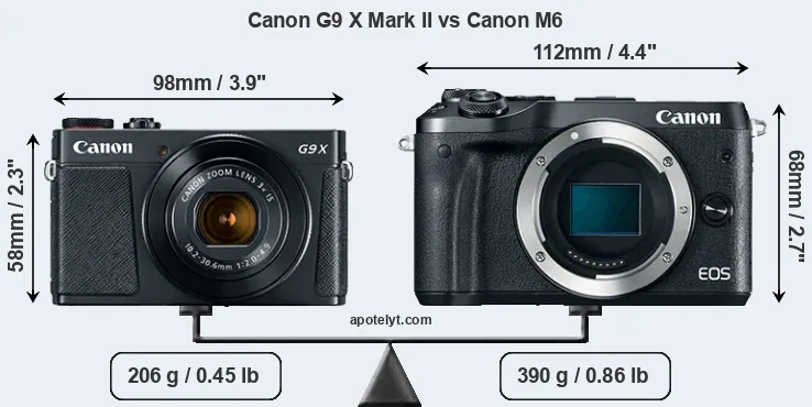 If the front view area (width x height) of the cameras is taken as an aggregate measure of their size, the Canon M6 is notably larger (34 percent) than the Canon G9 X Mark II. In this context, it is worth noting that neither the G9X Mark II nor the M6 are weather-sealed.