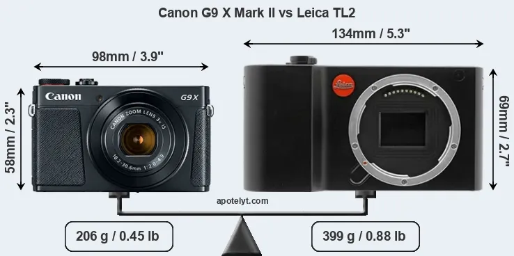 An illustration of the physical size and weight of the Canon G9 X Mark II and the Leica TL2 is provided in the side-by-side display below. The two cameras are presented according to their relative size. Three successive views from the front, the top, and the rear are shown. All width, height and depth dimensions are rounded to the nearest millimeter.
