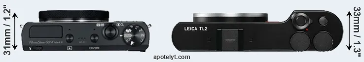 If the front view area (width x height) of the cameras is taken as an aggregate measure of their size, the Leica TL2 is considerably larger (63 percent) than the Canon G9 X Mark II. In this context, it is worth noting that neither the G9X Mark II nor the TL2 are weather-sealed.