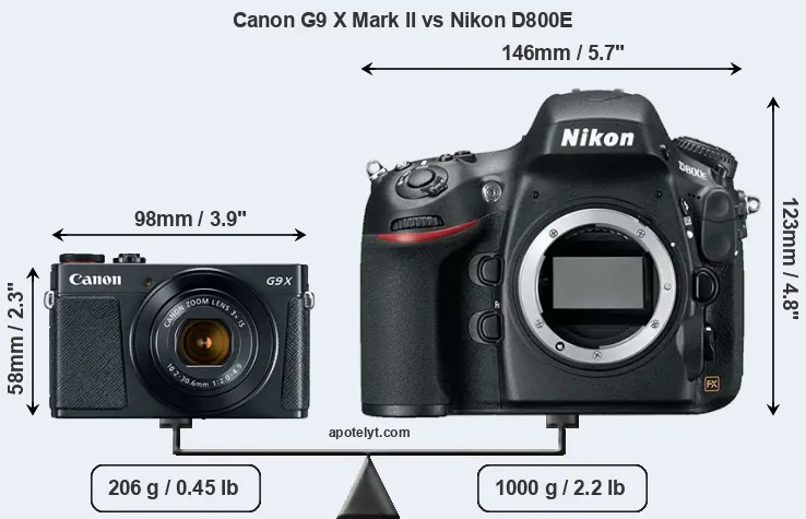 An illustration of the physical size and weight of the Canon G9 X Mark II and the Nikon D800E is provided in the side-by-side display below. The two cameras are presented according to their relative size. Three consecutive perspectives from the front, the top, and the back are available. All size dimensions are rounded to the nearest millimeter.