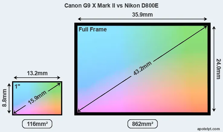Of the two cameras under consideration, the Canon G9 X Mark II features an one-inch sensor and the Nikon D800E a full frame sensor. The sensor area in the D800E is 643 percent bigger. As a result of these sensor size differences, the cameras have a format factor of, respectively, 2.7 and 1.0. Both cameras have a native aspect ratio (sensor width to sensor height) of 3:2.