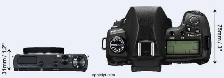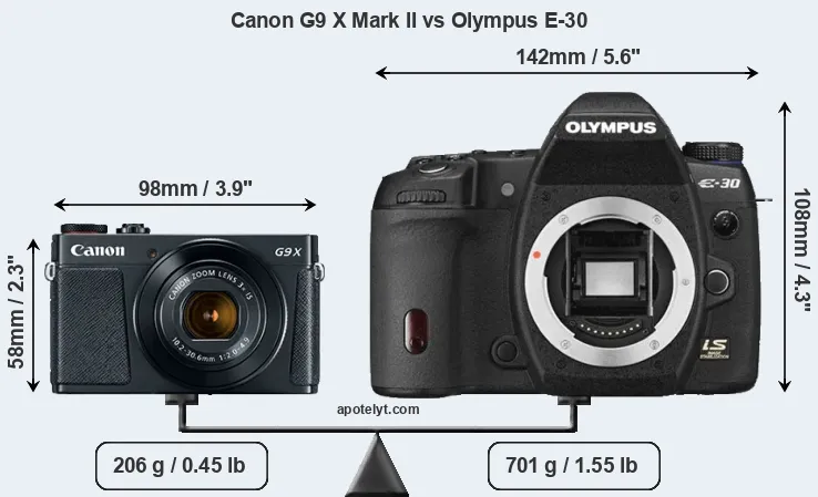 The side-by-side display below illustrates the physical size and weight of the Canon G9 X Mark II and the Olympus E-30. The two cameras are presented according to their relative size. Three consecutive perspectives from the front, the top, and the back are available. All width, height and depth measures are rounded to the nearest millimeter.