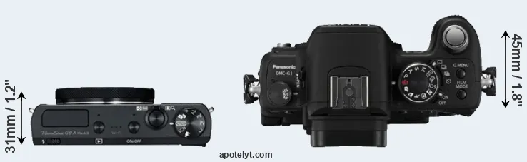 An illustration of the physical size and weight of the Canon G9 X Mark II and the Panasonic G1 is provided in the side-by-side display below. The two cameras are presented according to their relative size. Three successive views from the front, the top, and the rear are shown. All width, height and depth measures are rounded to the nearest millimeter.