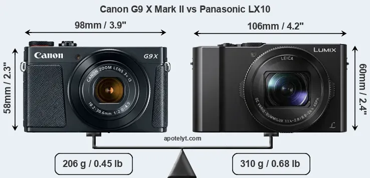 The side-by-side display below illustrates the physical size and weight of the Canon G9 X Mark II and the Panasonic LX10. The two cameras are presented according to their relative size. Three consecutive perspectives from the front, the top, and the back are available. All width, height and depth measures are rounded to the nearest millimeter.