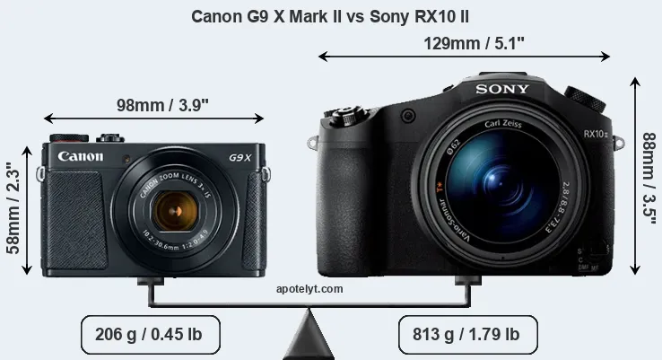 If the front view area (width x height) of the cameras is taken as an aggregate measure of their size, the Sony RX10 II is considerably larger (100 percent) than the Canon G9 X Mark II. Moreover, the RX10 II is substantially heavier (295 percent) than the G9X Mark II. It is noteworthy in this context that the RX10 II is splash and dust-proof, while the G9X Mark II does not feature any corresponding weather-sealing.