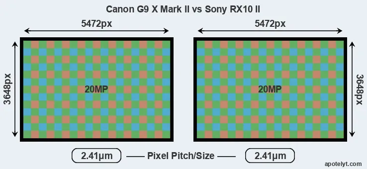 The two cameras under review do not only share the same sensor size, but also offer an identical resolution of 20 megapixels. This similarity in sensor specs implies that both the G9X Mark II and the RX10 II have the same pixel density, as well as the same pixel size. It should, however, be noted that the G9X Mark II is a somewhat more recent model (by 1 year and 6 months) than the RX10 II, and its sensor might have benefitted from technological advances during this time.