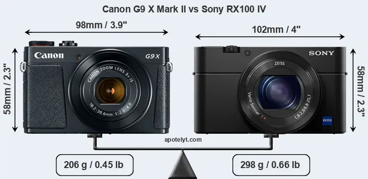 An illustration of the physical size and weight of the Canon G9 X Mark II and the Sony RX100 IV is provided in the side-by-side display below. The two cameras are presented according to their relative size. Three consecutive perspectives from the front, the top, and the back are available. All width, height and depth dimensions are rounded to the nearest millimeter.