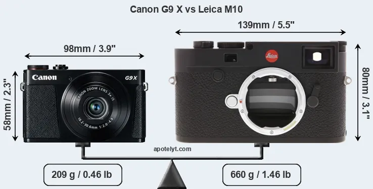 An illustration of the physical size and weight of the Canon G9 X and the Leica M10 is provided in the side-by-side display below. The two cameras are presented according to their relative size. Three successive views from the front, the top, and the rear are shown. All width, height and depth dimensions are rounded to the nearest millimeter.