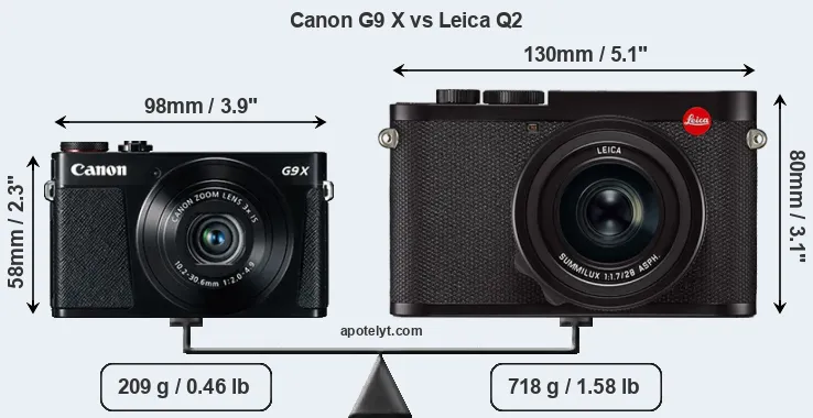 If the front view area (width x height) of the cameras is taken as an aggregate measure of their size, the Leica Q2 is considerably larger (83 percent) than the Canon G9 X. Moreover, the Q2 is substantially heavier (244 percent) than the G9X. It is noteworthy in this context that the Q2 is splash and dust-proof, while the G9X does not feature any corresponding weather-sealing.