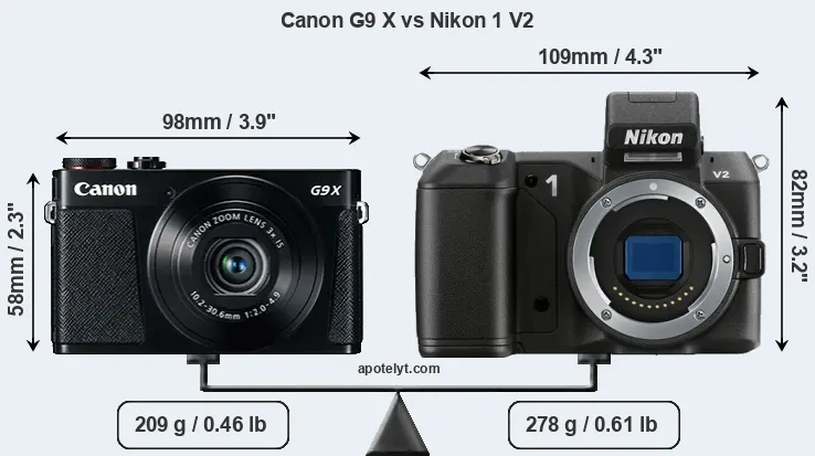 The physical size and weight of the Canon G9 X and the Nikon 1 V2 are illustrated in the side-by-side display below. The two cameras are presented according to their relative size. Three successive views from the front, the top, and the rear are shown. All width, height and depth measures are rounded to the nearest millimeter.