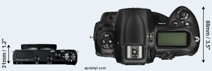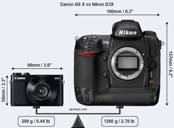 An illustration of the physical size and weight of the Canon G9 X and the Nikon D3X is provided in the side-by-side display below. The two cameras are presented according to their relative size. Three successive views from the front, the top, and the rear are shown. All width, height and depth dimensions are rounded to the nearest millimeter.